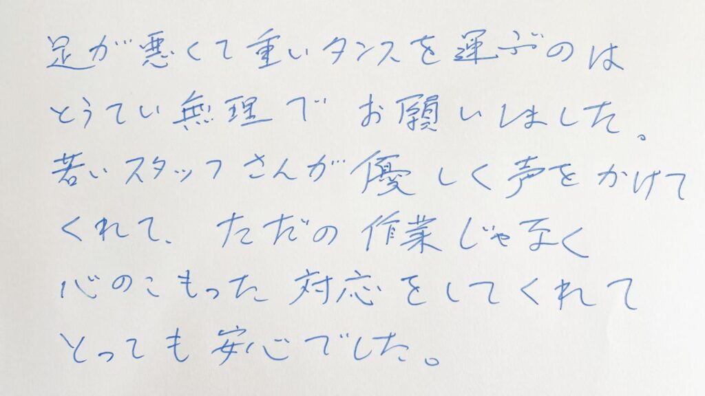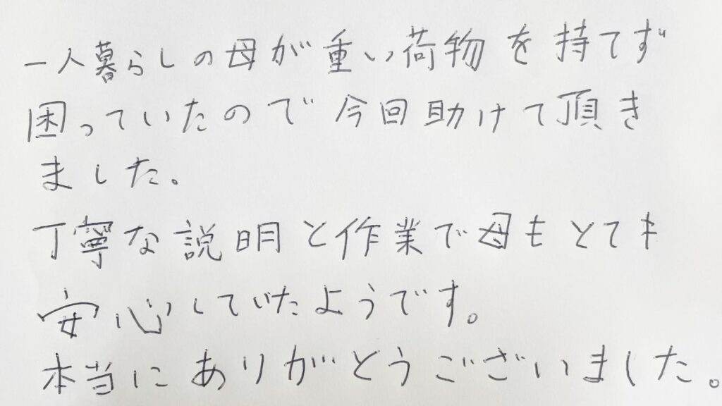 【満足度:100点】田中様(30代女性) 「一人暮らしの母が重い荷物をもてず困っていたので、今回助けて頂きました。丁寧な説明と作業で母もとても安心していたようです。本当にありがとうございました。女性スタッフの方が2名来てくださり、一人暮らしの私でも安心してお任せできました。作業も丁寧で、料金も事前にきちんと説明していただけたので追加料金の心配もありませんでした。また何かあったらお願いしたいです。」
