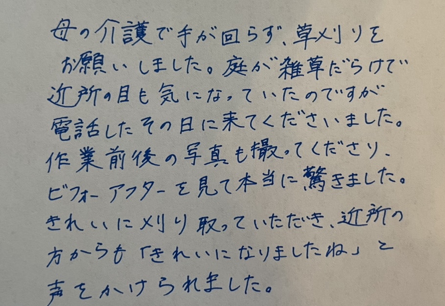【満足度:90点】 加藤様(45代女性) 「母の介護で手が回らず、草刈りをお願いしました。庭が雑草だらけで近所の目も気になっていたのですが、電話したその日に来てくださいました。作業前後の写真も撮ってくださり、ビフォーアフターを見て本当に驚きました。きれいに刈り取っていただき、近所の方からも『きれいになりましたね』と声をかけられました。」