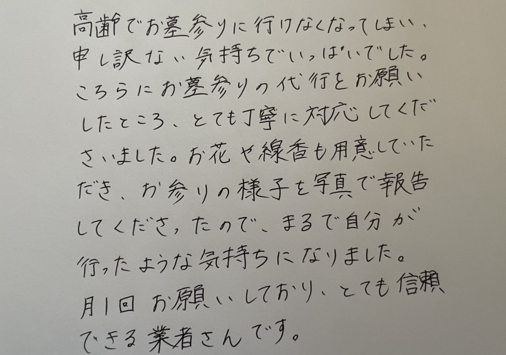 ✔ お墓の掃除が気になっているけど、なかなか行けずにいた。丁寧にお墓参りしてくれたから、心が少し軽くなった。