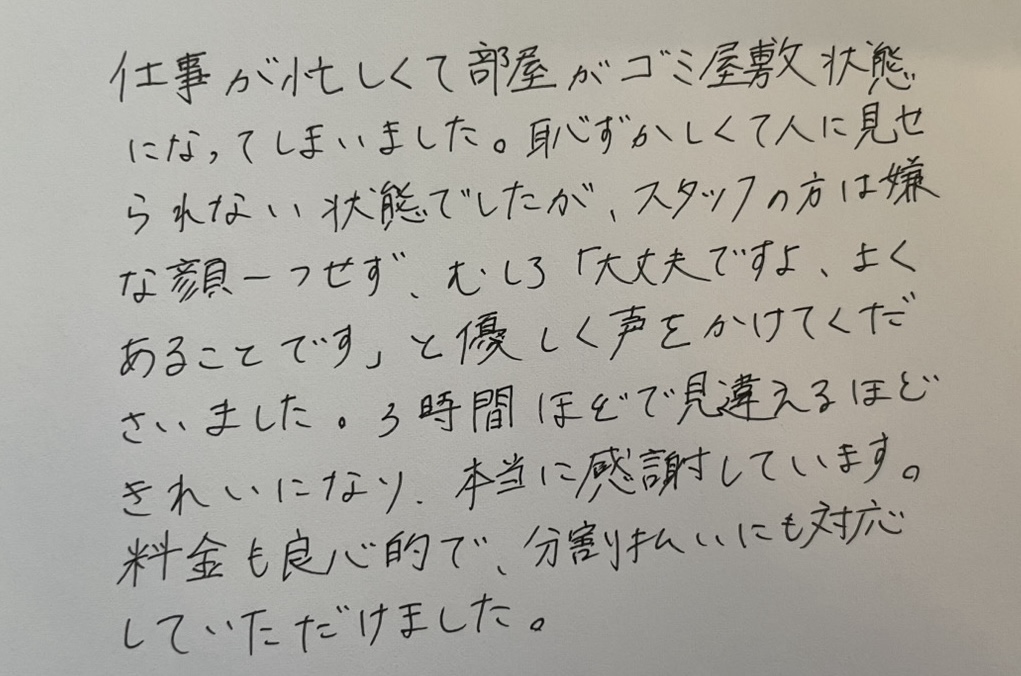 【スタッフより】 お忙しい中でのご依頼、ありがとうございました。どのような状態でも、お客様を責めることは決してございません。プライバシーもしっかりお守りし、迅速に作業を完了いたします。