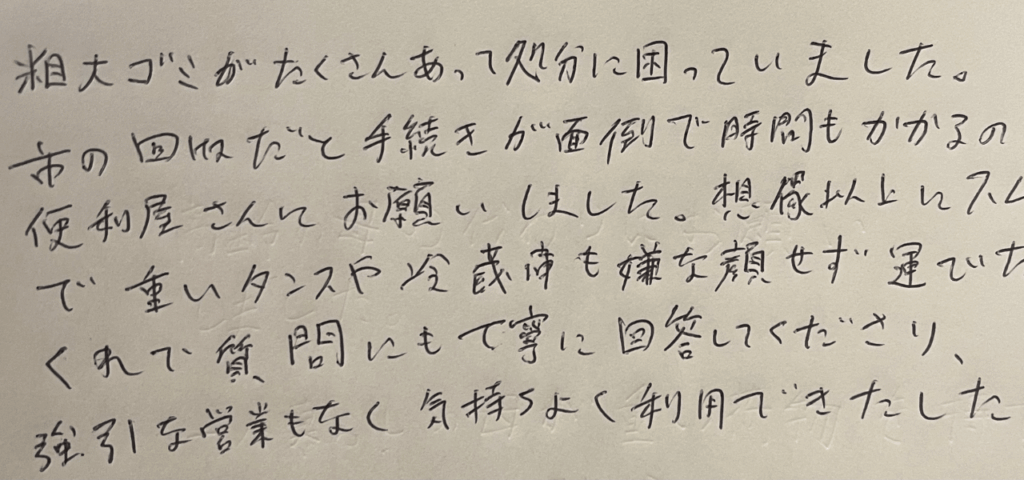 【満足度:95点】佐藤様(50代男性) 「粗大ゴミがたくさんあって処分に困っていました。市の回収だと手続きが面倒で時間もかかるので、便利屋さんにお願いしました。想像以上にスムーズで、重いタンスや冷蔵庫も嫌な顔一つせずに運び出してくれました。質問にも丁寧に回答してくださり、強引な営業も一切なく、」