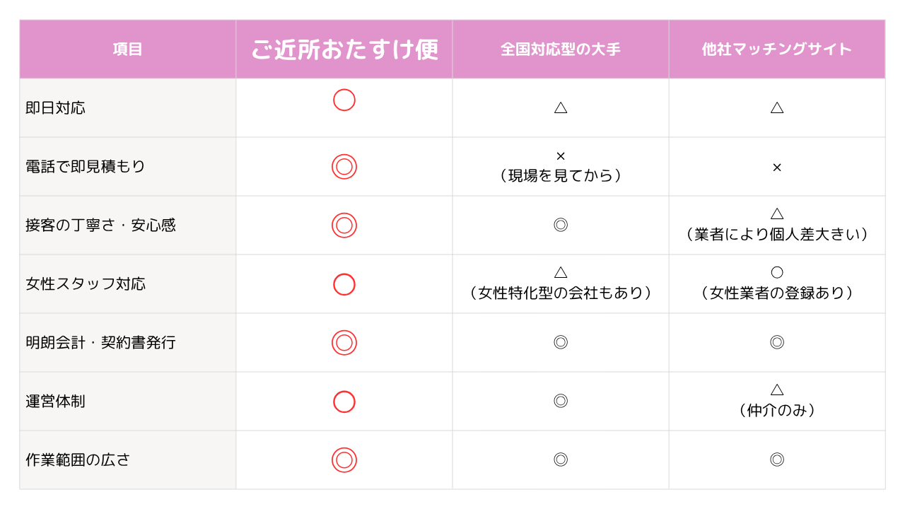 正直なところ、特定ジャンルに特化した専門業者(例:引越し専門業者様や不用品回収専門業者様など)に比べると専門性が劣る場合があるのも事実です。しかしその分、対応スピード、柔軟なサービス内容、明るく優しいスタッフの人柄でご満足いただける体制を整えております。
