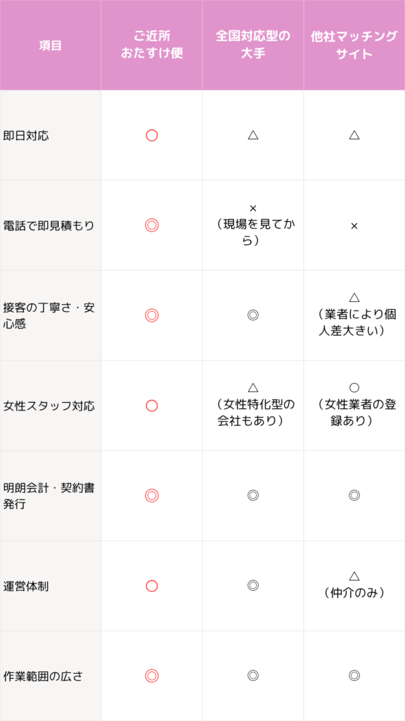 正直なところ、特定ジャンルに特化した専門業者(例:引越し専門業者様や不用品回収専門業者様など)に比べると専門性が劣る場合があるのも事実です。しかしその分、対応スピード、柔軟なサービス内容、明るく優しいスタッフの人柄でご満足いただける体制を整えております。
