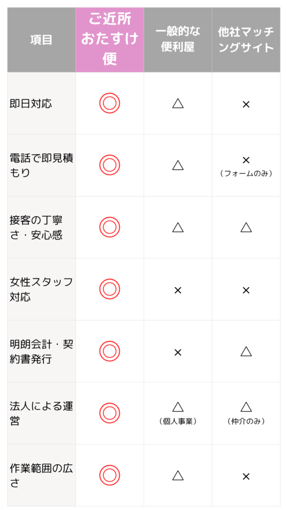 正直なところ、特定ジャンルに特化した専門業者(例:引越し専門業者様や不用品回収専門業者様など)に比べると専門性が劣る場合があるのも事実です。しかしその分、対応スピード、柔軟なサービス内容、明るく優しいスタッフの人柄でご満足いただける体制を整えております。